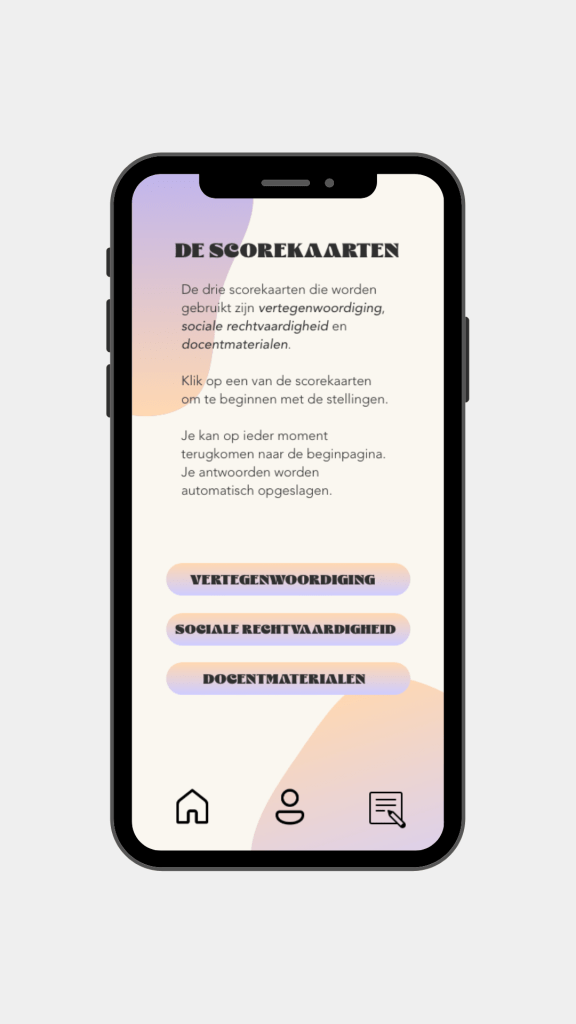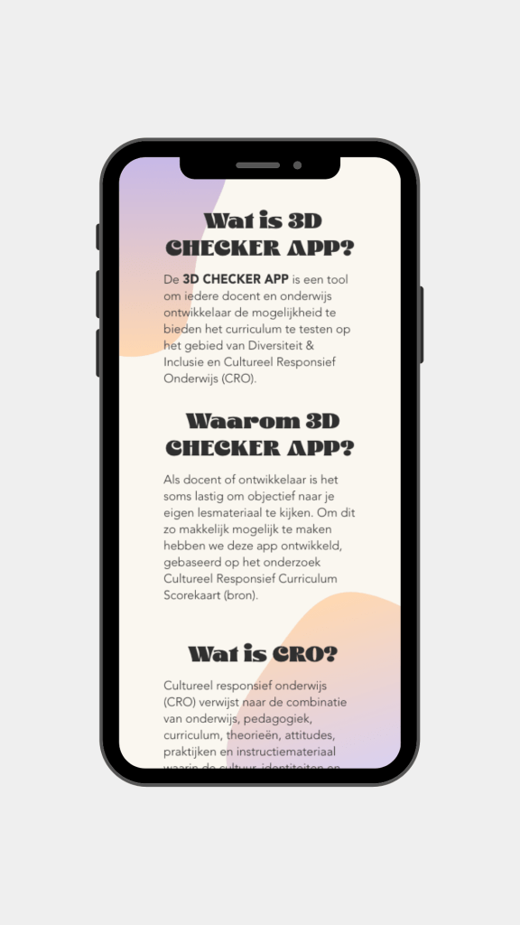 De Hogeschool van Amsterdam heeft mij gevraagd een app te ontwerpen om het testen van curricula op basis van diversiteit & inclusie vorm te geven. 3D staat voor de drie D’s die centraal staan op de hogeschool; Diversiteit & Inclusie, Duurzaamheid en Digitalisering. Een opdracht die goed aansluit bij mijn waarden. Voor het eerste prototype van de app hebben we ons voornamelijk gefocust op de eerste D; Diversiteit & Inclusie. Het biedt professionals de mogelijkheid het curriculum te testen op de mate van inclusiviteit.